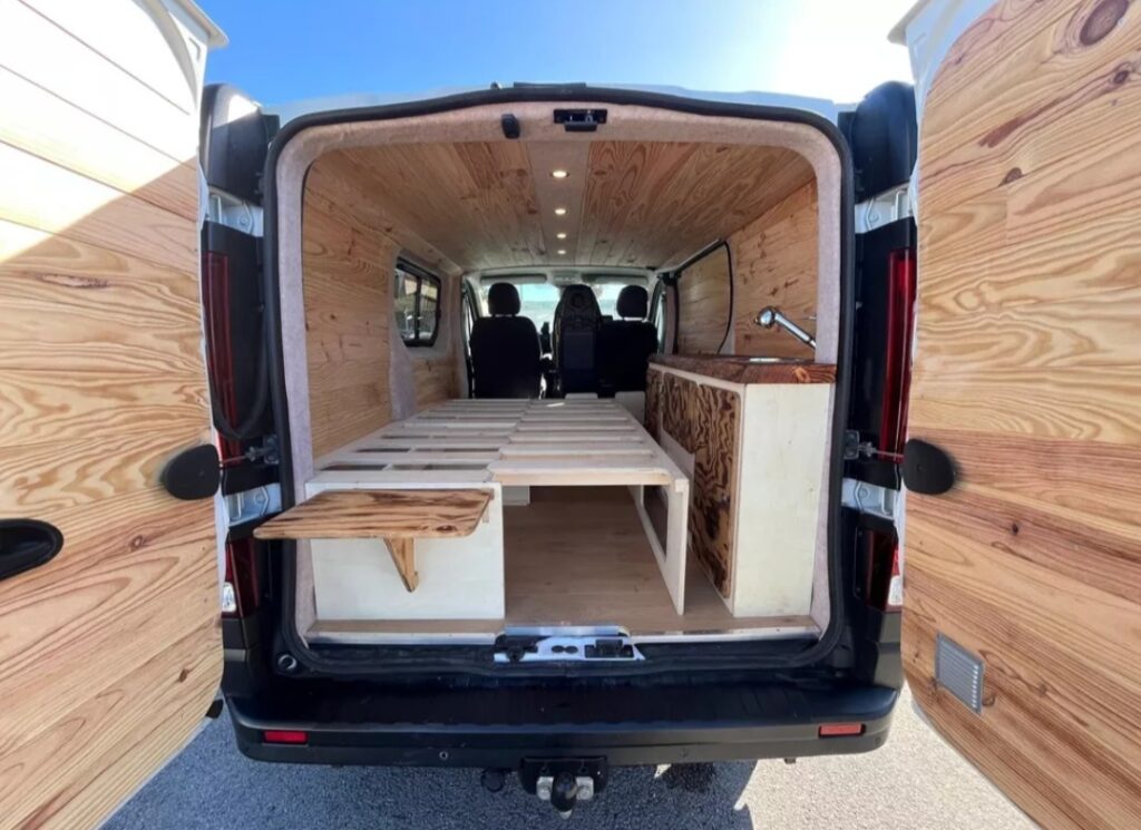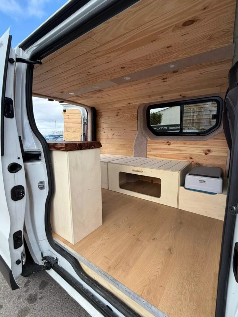 Trafic 3 – L1H1 – Aménagement complet Renault Trafic aménagé pour 2 personnes, idéal pour des weekends prolongés en pleine nature.Isolation : mix Armaflex 10/19mm, laine Biofib dans les montants Pose de baie latérale coulissante. Habillage lambris pin maritime, finition feutrine beige, bois brûlé.Module lit-peigne 190×60-120cmKitchennette avec réservoir d’eau claire (30L), réservoir d’eaux grises (19L), pompe immergée, évier avec douchette Batterie auxiliaire 100ah LiFePo, chargeur DC-DC 30A Glacière 22L